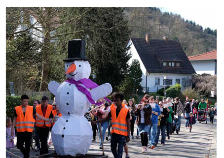 Am Samstag, den 21. März um 14 Uhr nimmt der Sommertagszug an der Rückseite des S-Bahnhofs Schlierbach-Ziegelhausen am Platz der Begegnung seine Aufstellung. Der Zug wird über den Gutleuthofweg zur Orthopädie ziehen. Dort wird der Schneemann in Flammen aufgehen und damit symbolisch den Winter austreiben.
